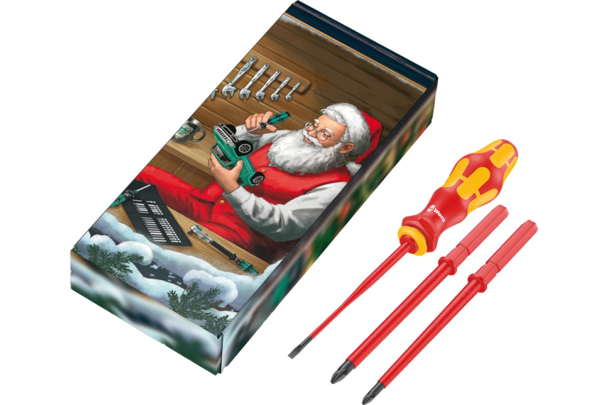 Набор рождественских отверток Wera 817/4 VDE включает одну рукоятку 817 VDE Kraftform, предназначенную исключительно для насадок Wera VDE, и 3 насадки VDE (каждая длиной 154 мм). Шлицевая насадка Wera 05135807001 Kraftform Kompakt 60 iS 0,6 x 3,5 x 154 с уменьшенным диаметром лезвия со встроенной защитной изоляцией позволяет доставать и работать с низко расположенными винтовыми и пружинными элементами. Набор Wera X-Mas состоит из 4 предметов и упакован в подарочную упаковку без рекламы и новогодней тематики.