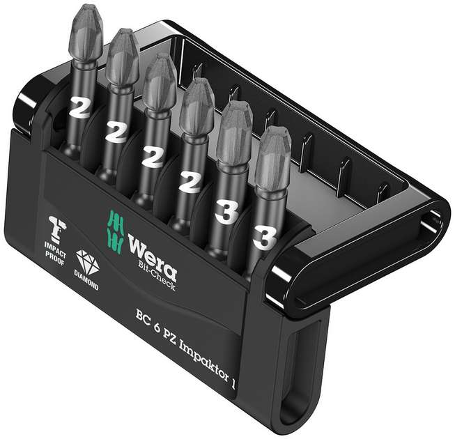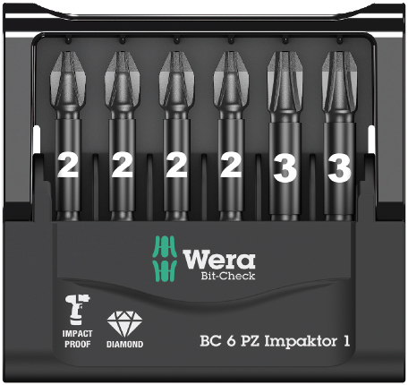 6 битов Wera Impaktor удобно и компактно размещены в практичном наборе Bit-Check. Благодаря наилучшему использованию свойств материала и оптимальному подбору геометрических параметров технология Impaktor обеспечивает изделиям срок службы, превышающий средние показатели даже с учетом жестких условий их применения. Наконечник бита покрыт мельчайшими алмазными частицами и за счёт сопротивления трением снижает выскальзывание из винта.