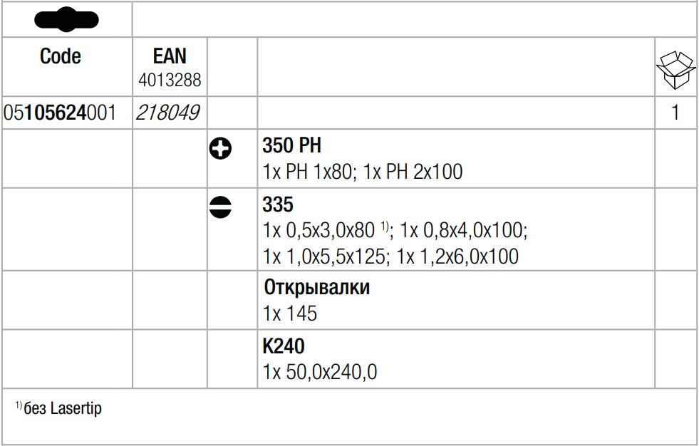- Твердые зоны ручки для высокой скорости работы, в то время как мягкие зоны ручки обеспечивают передачу больших моментов силы. Часть из них с наконечником Lasertip: Lasertip надёжно вгрызается в головку винта и предотвращает выскальзывание отвёртки из головки винта