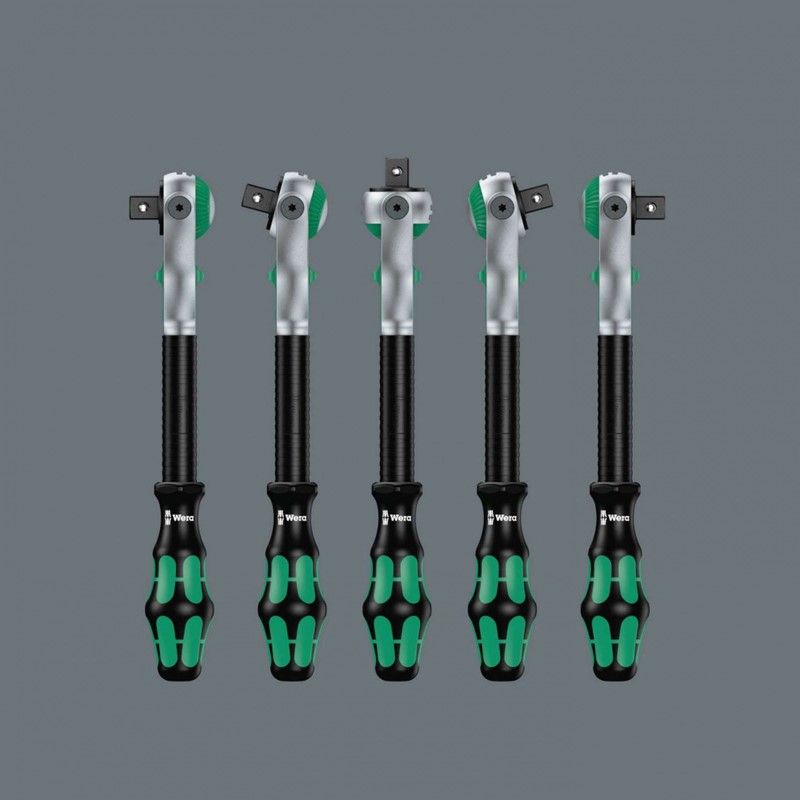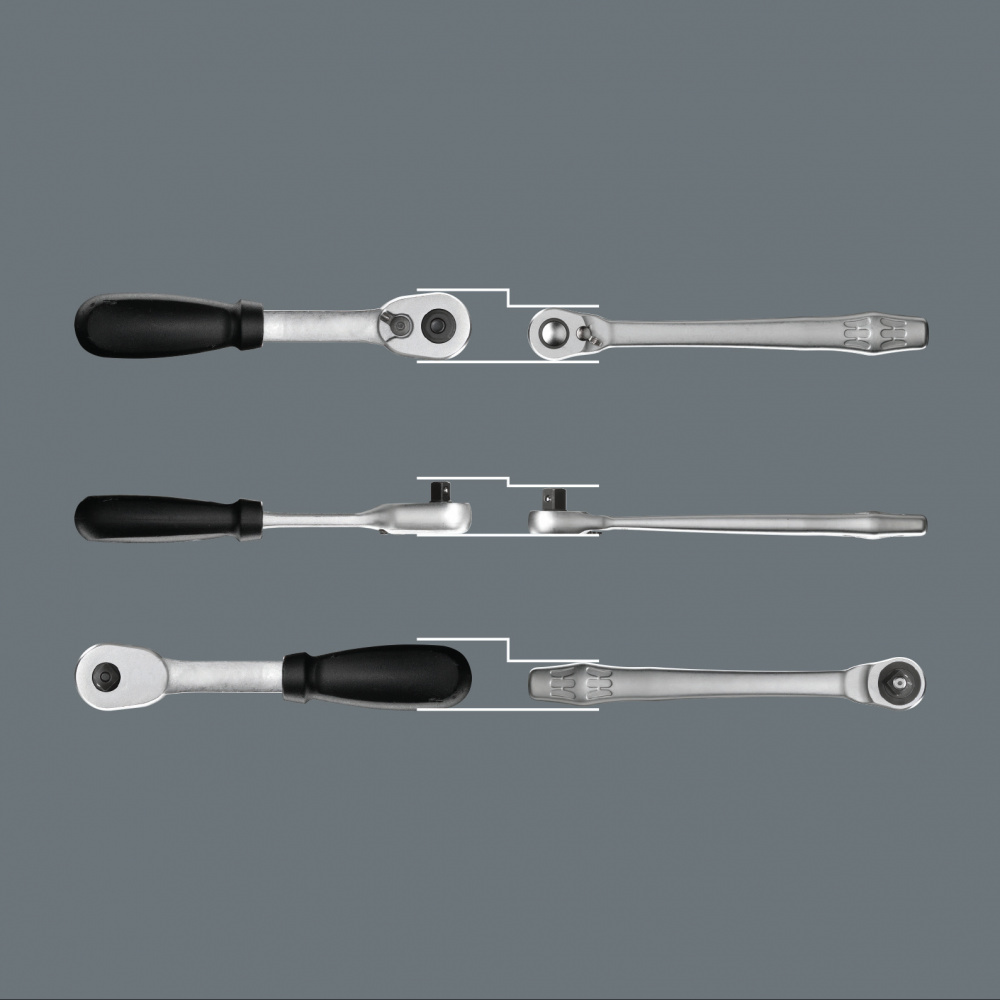 Компактный набор с трещотками. 2 трещотки 1/4" Zyklop Speed и Zyklop Metal с переключателем реверса плюс 6 принадлежностей. Конструкция с использованием инерционной массы и нескользящая в пальцах гильза свободного хода для высокой скорости работы трещоткой Zyklop Speed; свободно поворачивающаяся головка трещотки; Фиксация в положении под углом 0°, 90° влево и вправо, а также при возврате на 15° относительно 90°; в положении 0° можно использовать как обычную отвёртку; надежная фиксация насадок, в т.ч. при использовании в качестве отвёртки; переключатель реверса; тонкий механизм зацепления; малый угол возврата 5°; многокомпонентная ручка Kraftform для малоутомительной работы. Трещотка Zyklop Metal с переключателем реверса; тонкая форма для работы также в узком пространстве; тонкий механизм зацепления на 72 зубца обеспечивает малый угол возврата 5°; с переключателем реверса для удобного изменения направления вращения; с функцией надёжной блокировки головок; кованая цельнометаллическая трещотка (хромомолибденовая сталь) сверхпрочная, с большим сроком службы; невероятно компактное размещение большого набора инструментов в небольшом объеме; очень компактный футляр с высокой прочностью и большим сроком службы; с возможностью вертикального размещения для лучшего обзора инструментов на полке в мастерской; благодаря текстильной фактуре футляр можно без опаски класть на легкоповреждаемую поверхность; малый вес и объем - для повышения мобильности.
