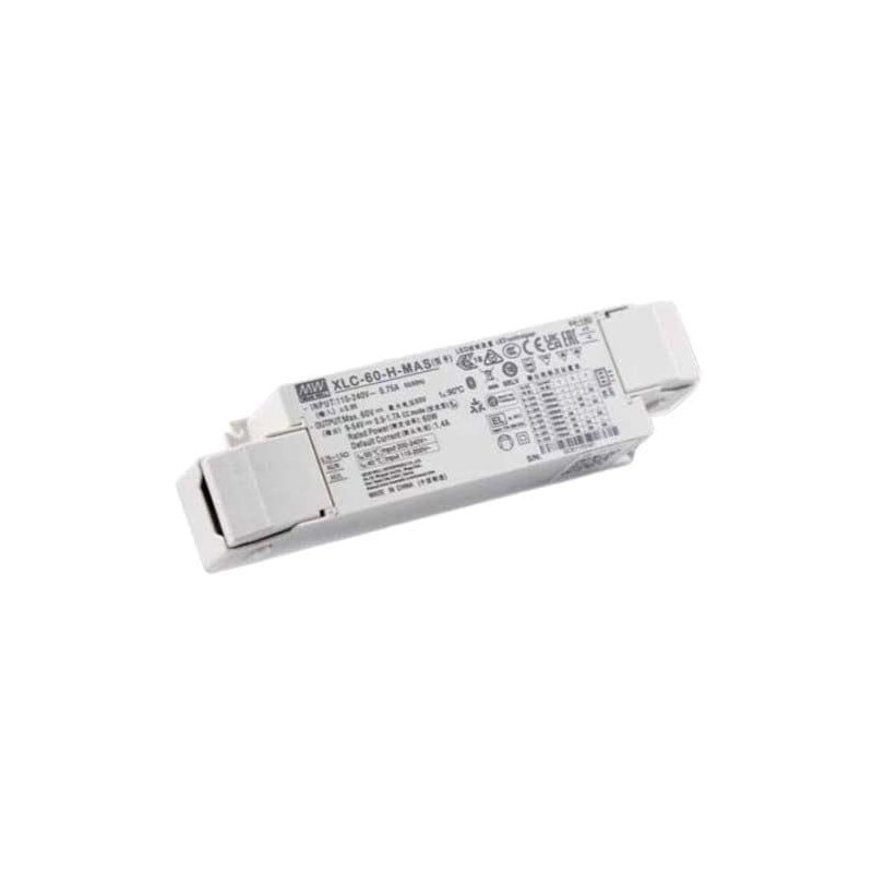 Серия XLC-60 представляет собой светодиодный драйвер мощностью 60 Вт с постоянной мощностью и постоянным выходным напряжением. Он может работать от напряжения 110–305 В переменного тока и выходного тока в диапазоне от 900 мА до 1700 мА, выбираемого с помощью DIP-переключателя или настройки NFC.