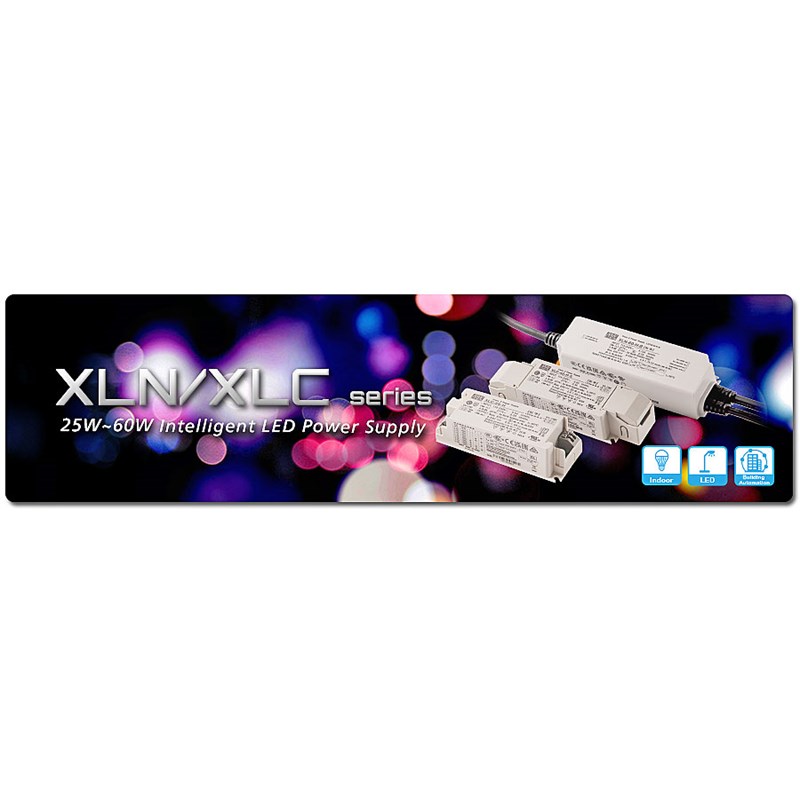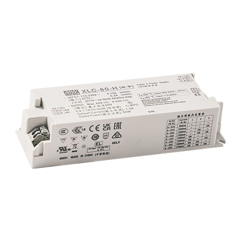 Серия XLC-60 представляет собой светодиодный драйвер мощностью 60 Вт с постоянной мощностью и постоянным выходным напряжением. Он может работать от напряжения 110–305 В переменного тока и выходного тока в диапазоне от 900 мА до 1700 мА, выбираемого с помощью DIP-переключателя или настройки NFC.