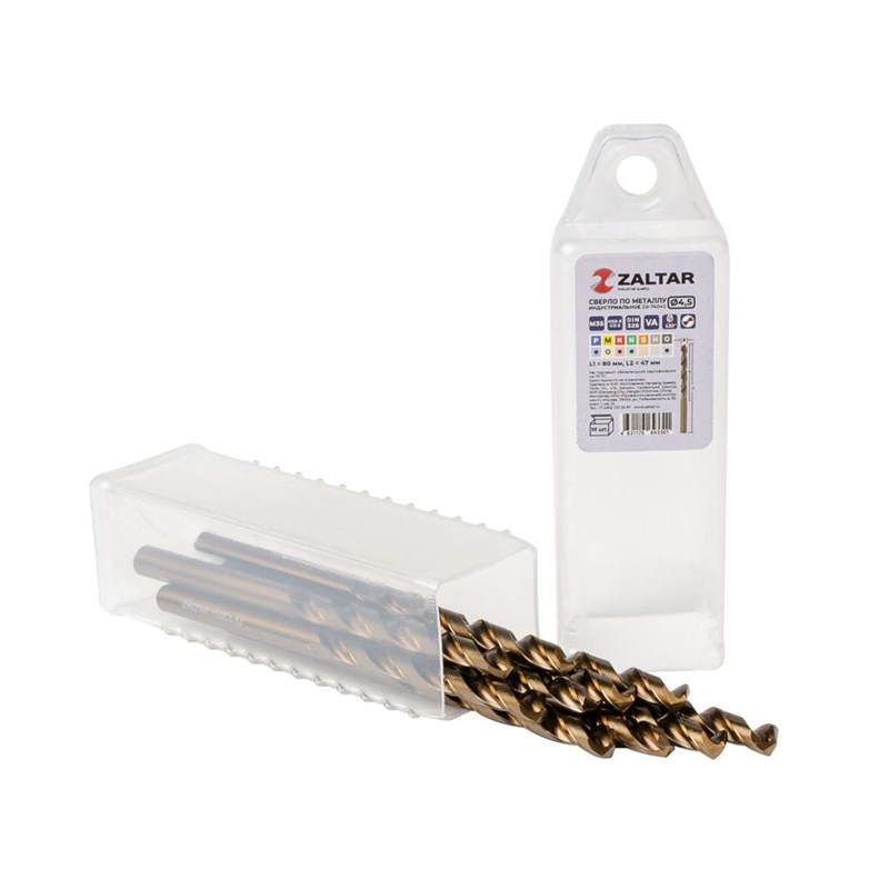 Комплект свёрл спиральных по металлу индустриального качества HSS-E Co5 M35 (аналог Р6М5К5) DIN 338 используется для сверления легированной и обычной стали прочностью от 900 Н/мм2 до 1100 Н/мм2, а также алюминия, нержавеющей стали, латуни и пластика.