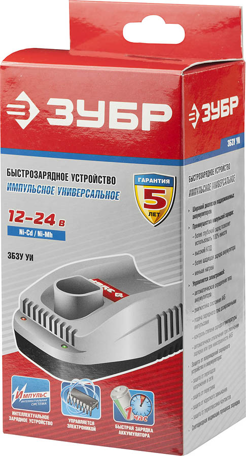 Зарядное устройство ЗУБР ЗБЗУ УИ, предназначены для зарядки батарей аккумуляторного инструмента. Преимущества интеллектуальной зарядки: более глубокий заряд позволяет использовать 100% емкости; высокий КПД; более щадящая зарядка аккумулятора; меньше нагрев. Широкий диапазон поддерживаемых аккумуляторов. Управляется электроникой: диагностика состояния АКБ; контроль степени заряда и температуры; автоматическое отключение по окончании зарядки или при неисправности АКБ. Защита от повреждений зарядного устройства и аккумулятора: защита от перепадов напряжения в сети; защита от перегрева; защита от короткого замыкания; защита от переполюсовки контактов. Светодиодная индикация процесса зарядки.