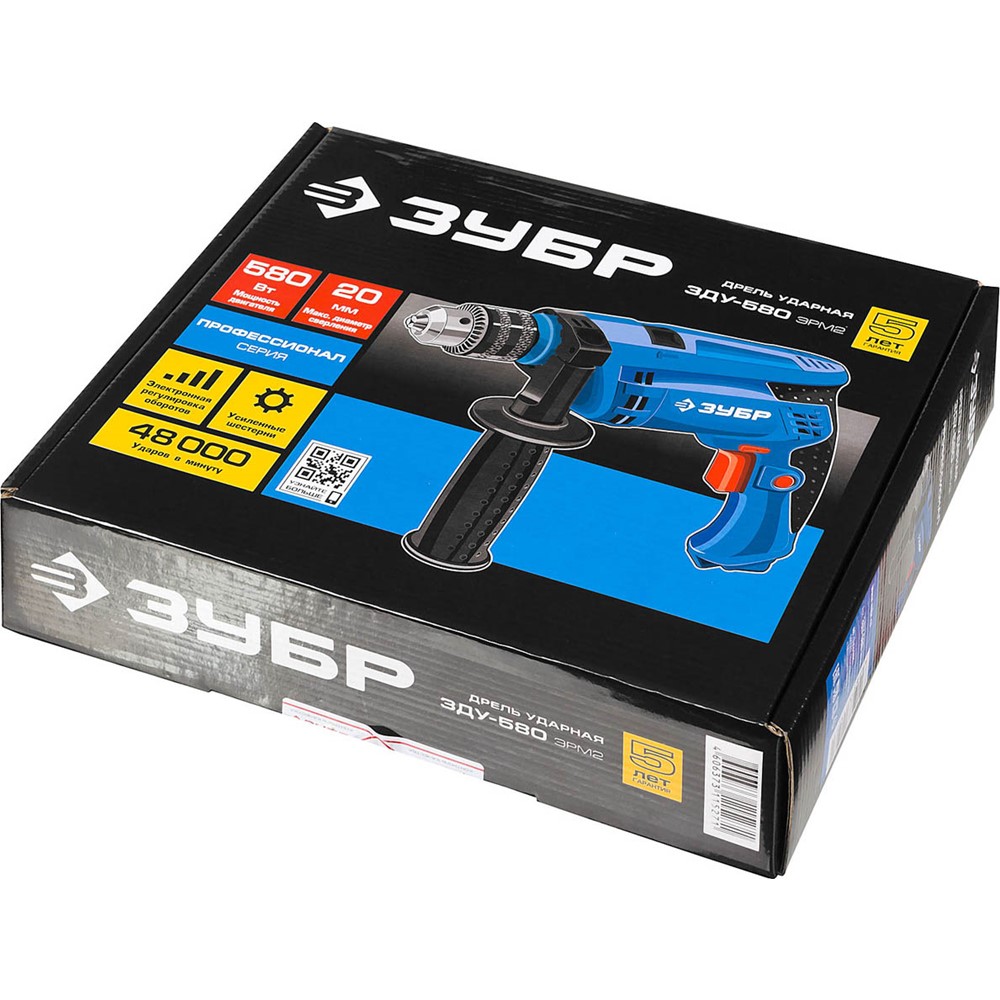 Дрель удар, ЗУБР Профессионал ЗДУ-580 ЭРМ2, патрон 13мм, реверс, d: сталь-10 мм/бетон-13 мм/дерево-20 мм, 0-3000 об/мин, 0-48000 уд/мин, 580 Вт
