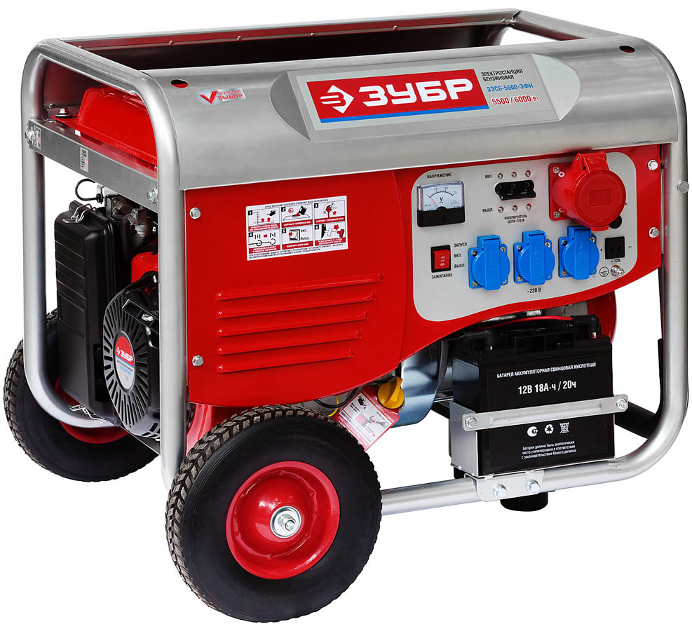 Бензиновый электрогенератор ЗУБР ЗЭСБ-5500-ЭФН, предназначен для обеспечения энергией потребителей в загородном доме, на строительной площадке и в мастерской. Мощный генератор для любых нужд. Высокий ресурс генераторов подтверждается тестами, проведенными как в лаборатории, так и в реальных условиях. Он составляет не менее 500 часов непрерывной работы при полной нагрузке на генератор (средний ресурс обычного бензинового генератора составляет всего 300 часов). После этого требуется провести ТО и замену свечи зажигания и фильтров. Генераторы обеспечивают качественные выходные параметры электрического тока. В частности смещение синусоиды составляет не более 24%, что позволяет использовать их даже для питания сварочных инверторов (при этом нужно обязательно учитывать максимально допустимую нагрузку на генератор). Экономичный четырехтактный бензиновый двигатель с верхним расположением клапанов (OHV) проще заводится при минусовой температуре и неприхотлив в эксплуатации.