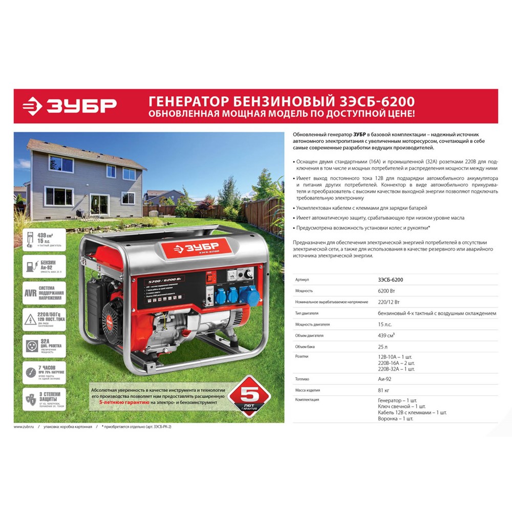 Бензиновый электрогенератор ЗУБР ЗЭСБ-6200, предназначен для обеспечения энергией потребителей в загородном доме, на строительной площадке и в мастерской. Мощный генератор для любых нужд. Высокое качество выходной энергии делает безопасным подключение к генератору даже самой требовательной техники. 4-тактный двигатель - простота использования и обслуживания, длительный срок службы, отличные экономические и экологические показатели. Система поддержания параметров выходного напряжения (AVR) обеспечивает стабильность характеристик для питания, в том числе наиболее требовательных потребителей - компьютеров и другой электронной техники. Раздельные системы питания и смазки избавляют от необходимости приготовления рабочей смеси. Система контроля и блокировки работы при отсутствии или пониженном уровне масла. Два типа выходного напряжения - 220В/50Гц и 12В пост. тока - позволяют подключать любых необходимых для активного отдыха потребителей.