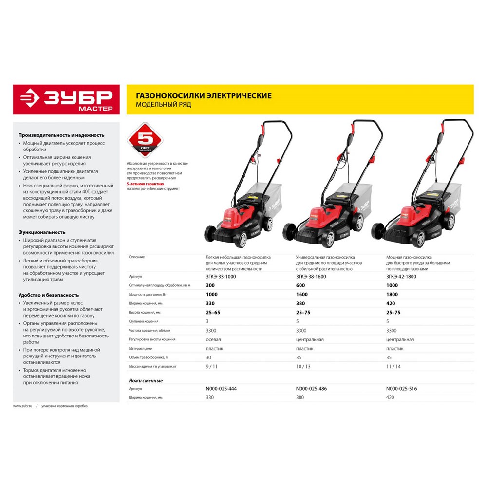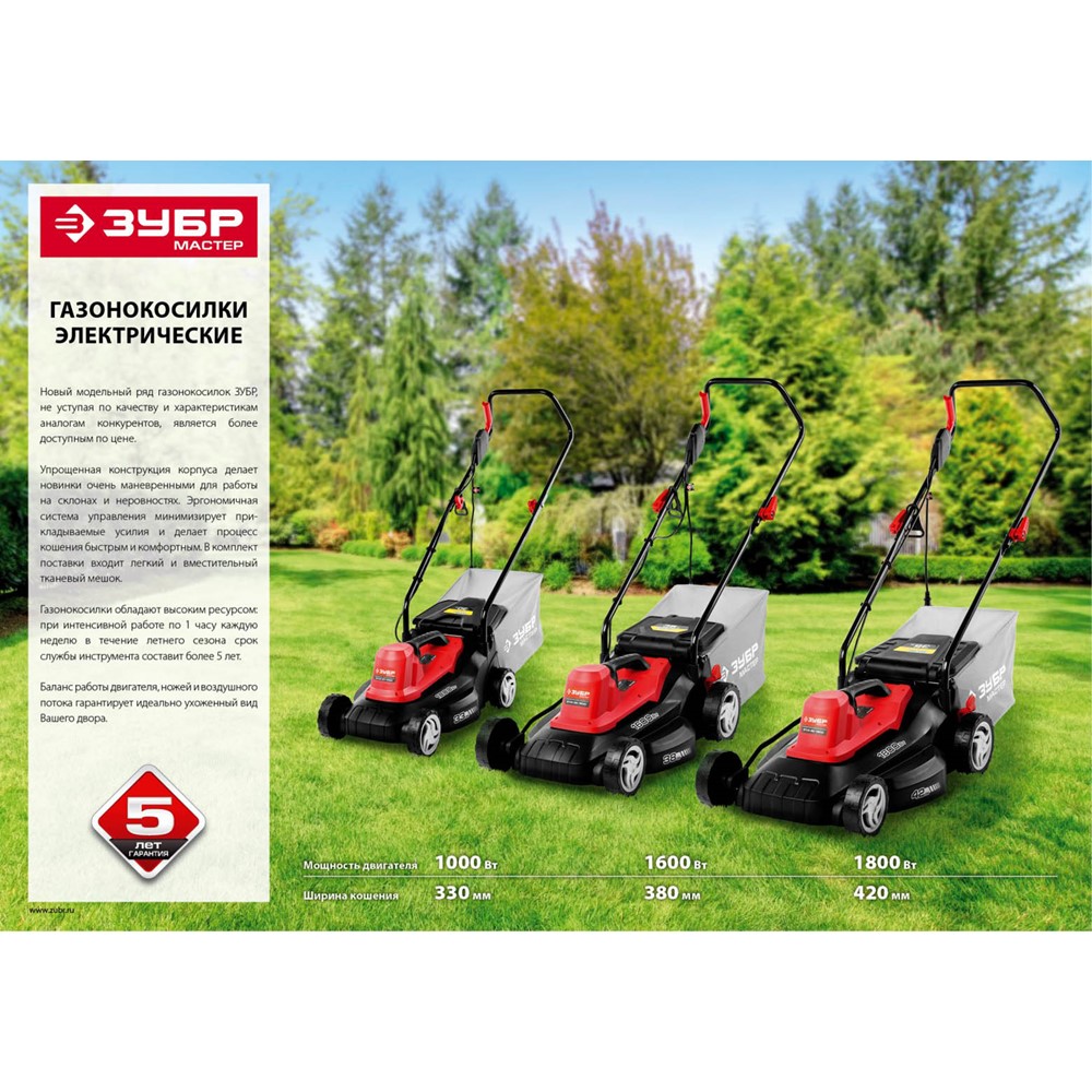 Газонокосилка электрическая ЗУБР ЗГКЭ-33-1000, предназначена для подстригания травы при уходе за газоном. В комплект входит легкий и вместительный тканевый мешок. Оптимальная ширина кошения увеличивает ресурс изделия. Усиленные подшипники двигателя делают его более надежным. Нож специальной формы создает восходящий поток воздуха, который поднимает полегшую траву, направляет скошенную траву в травосборник и даже может собирать опавшую листву. Широкий диапазон кошения расширяет возможности применения газонокосилки. Легкий и объемный травосборник позволяет поддерживать чистоту на обработанном участке и упрощает утилизацию травы. Увеличенный размер колес и эргономичная рукоятка облегчают перемещение косилки по газону. Органы управления расположены на регулируемой по высоте рукоятке, что повышает удобство и безопасность работы. При потере контроля над машиной режущий инструмент и двигатель останавливаются. Тормоз двигателя мгновенно останавливает вращение ножа при отключении питания.