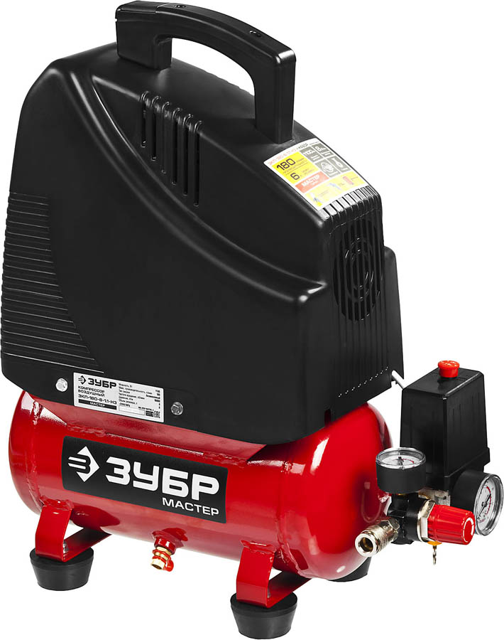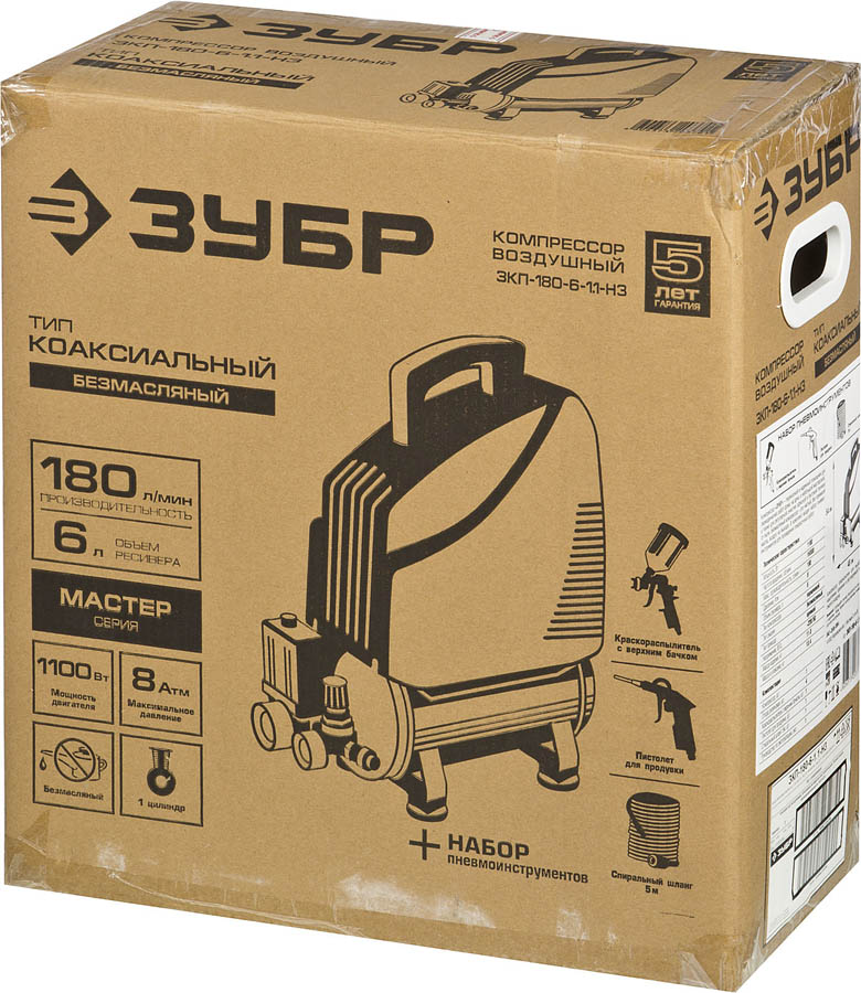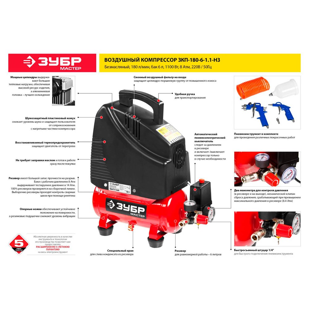 Компрессор воздушный безмасляный с набором аксессуаров, 180 л/мин, 6 л, 1100 Вт, ЗУБР