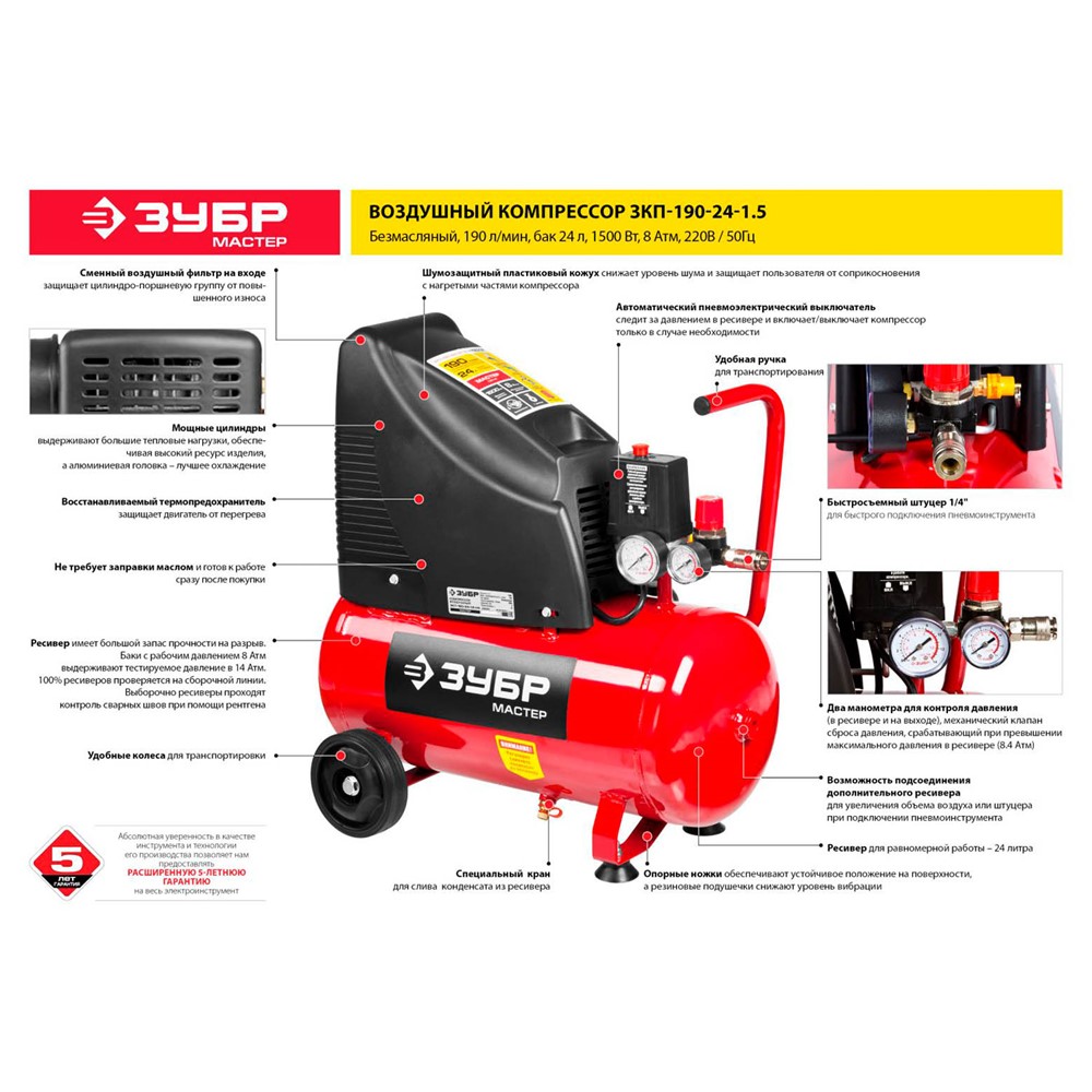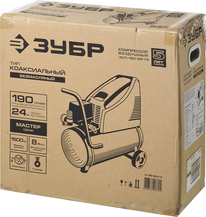 Компрессор воздушный безмасляный, 190 л/мин, 24 л, 1500 Вт, ЗУБР