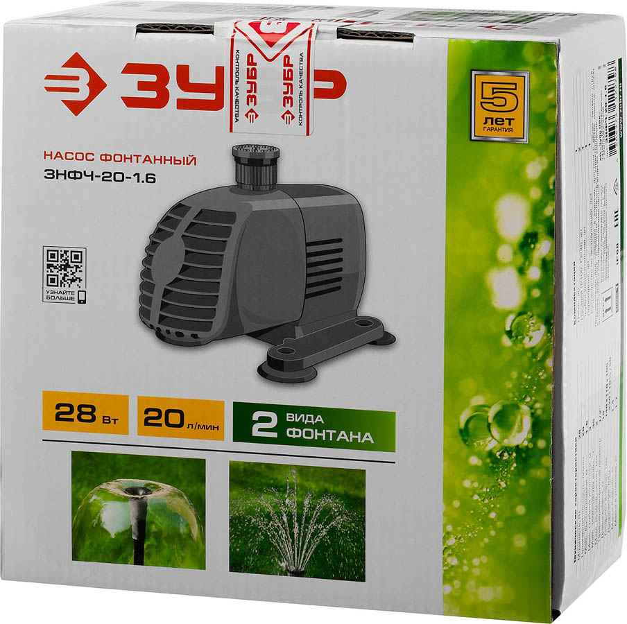 Насос фонтанный ЗУБР ЗНФЧ-20-1.6, предназначен для украшения водоемов фонтаном с различными типами струй, а также водопадом. Также может использоваться для перекачки чистой воды из водоемов с учетом технических характеристик модели. Простое и надежное устройство, позволяющее превратить обычный участок в замечательный сад. Две формы фонтанной струи - колокольчик и каскад. Плавная регулировка струи "колокольчик" и легкая смена типа фонтана. Для чистой воды. Возможность организовать водопад. Удлинительная трубка в комплекте. Крепление к плиточному или пластиковому дну водоема. Губчатый фильтр для защиты насоса от попадания частиц грязи.