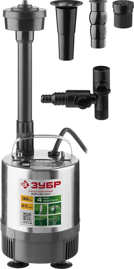 Насос фонтанный, ЗУБР ЗНФЧ-23-1.9-C, нерж сталь, для чистой воды, напор 1,9 м, насадки: колокольчик, гейзер, каскад, 38 Вт, 23 л/мин