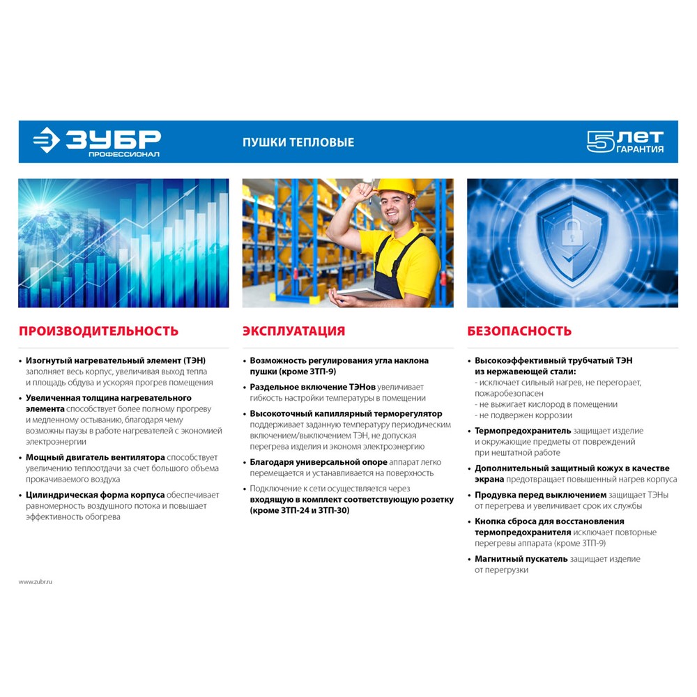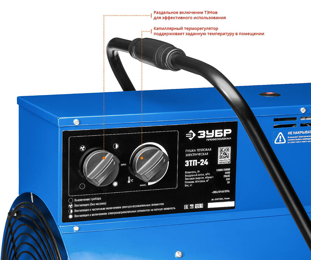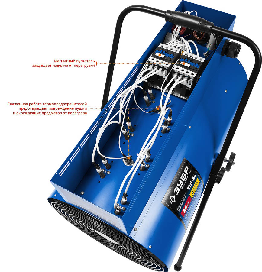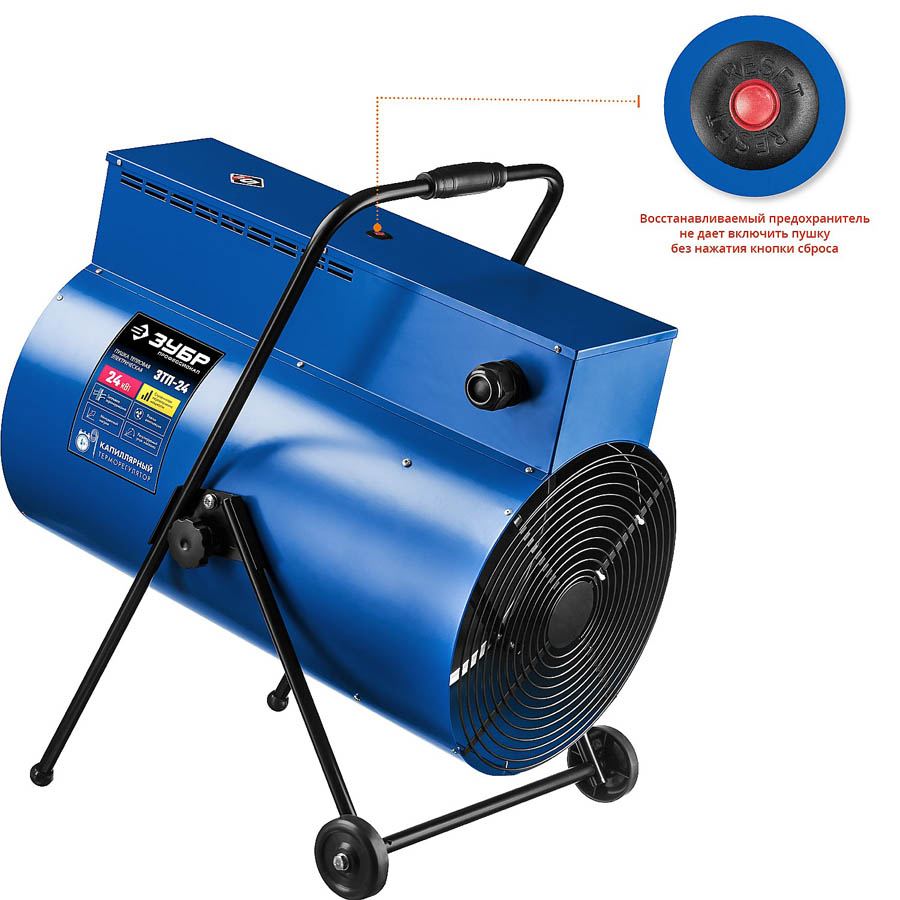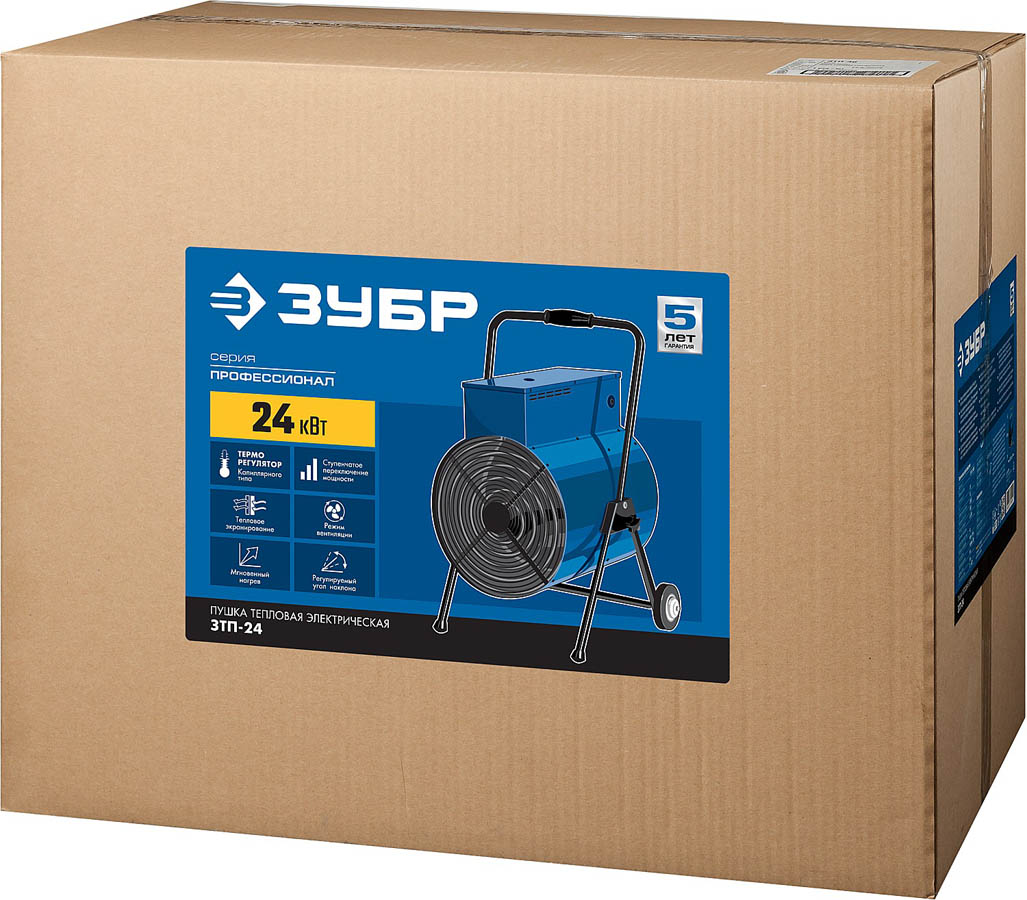 Тепловая пушка электрическая ЗУБР ЗТП-24, предназначена для генерации горячего воздуха, который может быть использован для обогрева, сушки бытовых и промышленных помещений.