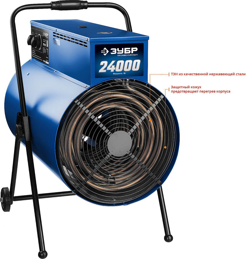 ЗУБР 24 кВт, 380 В, гладкий ТЭН, пушка тепловая электрическая, ЗТП-24 Профессионал